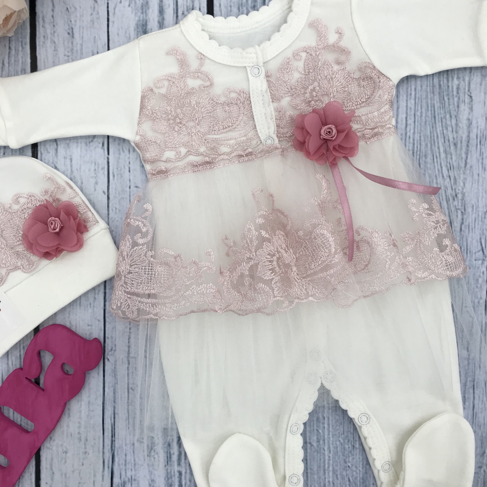 Украшен нежным кружевом и  кружевными элементами цвета пудра