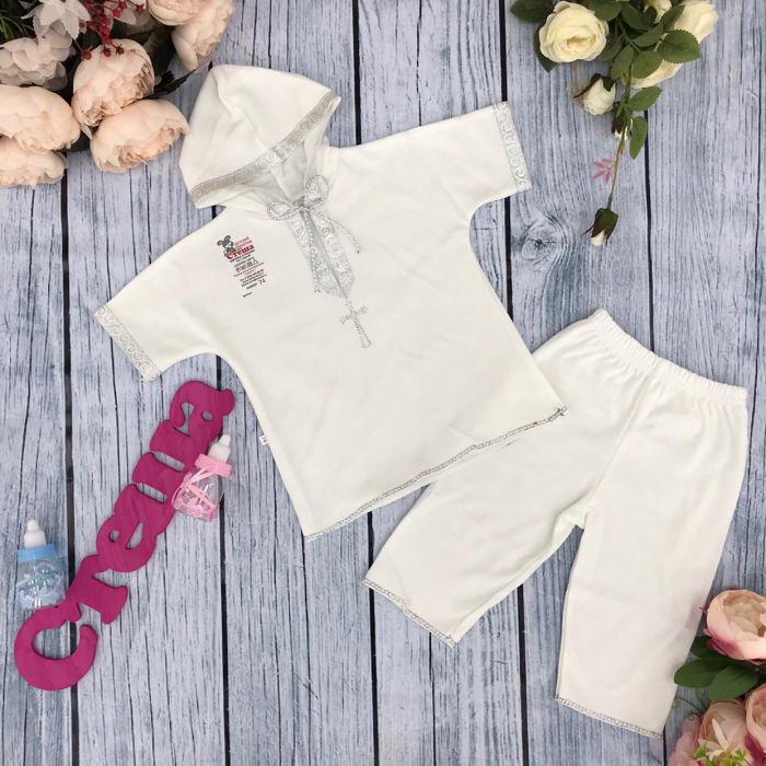 Теги: Купить оптом крестильную рубашку. 215-С. Крестильная рубашка со штанами (серебро), интерлок 62,68,74,80 цена,отзывы официальный сайт "Стеша Дзержинск"